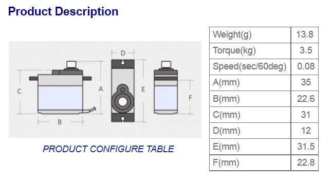 - Torque: 3.1kg/cm (5.0v); 3.5kg/cm (6.0v)